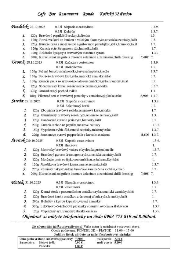28.10.2025 Polievka 1. Hŕstková s údeninou 1 0,33 l 2,05 € Polievka 2. Boršč 7 0,33 l 2,15 € Hl. jedlo 1. Belehradský bravčový rezeň, varené zemiaky 1 120 g 6,10 € Hl. jedlo 2. Kuracie rezance na hubách, tarhoňa, zeleninový šalát 1 120 g 6,00 € Hl. jedlo 3. Penne so špenátom a šunkou 1,3,7 350 g 7,00 € Hl. jedlo 4. Pizza Capresse 1,3,7 350 g 6,90 € Špec. týždňa Chilli con carne v placke 1,3,7 120 g 8,10 €