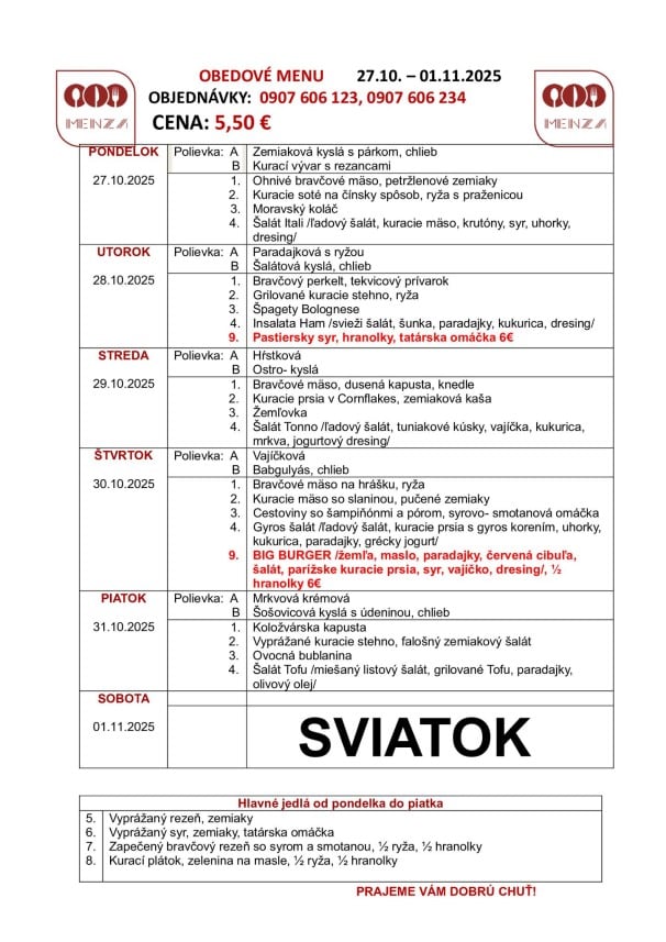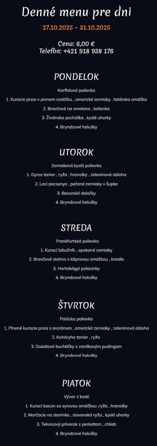 Polievka: Hydinový vývar s cestovinou Hlavné jedlá: 1. Bravčové stehno na šampiňónoch, knedle 2. Kelový prívarok, bravčový perkelt 3. Furmanský prírodný rezeň, slovenská ryža, cviklový šalát 4. Kurací paprikáš na smotane, maslové halušky 5. Kuracie prsia v syrovom cestíčku, zemiaková kaša 6. Vyprážané kuracie stehno, zemiakový šalát 7. Tofu na čínsky spôsob, ryža