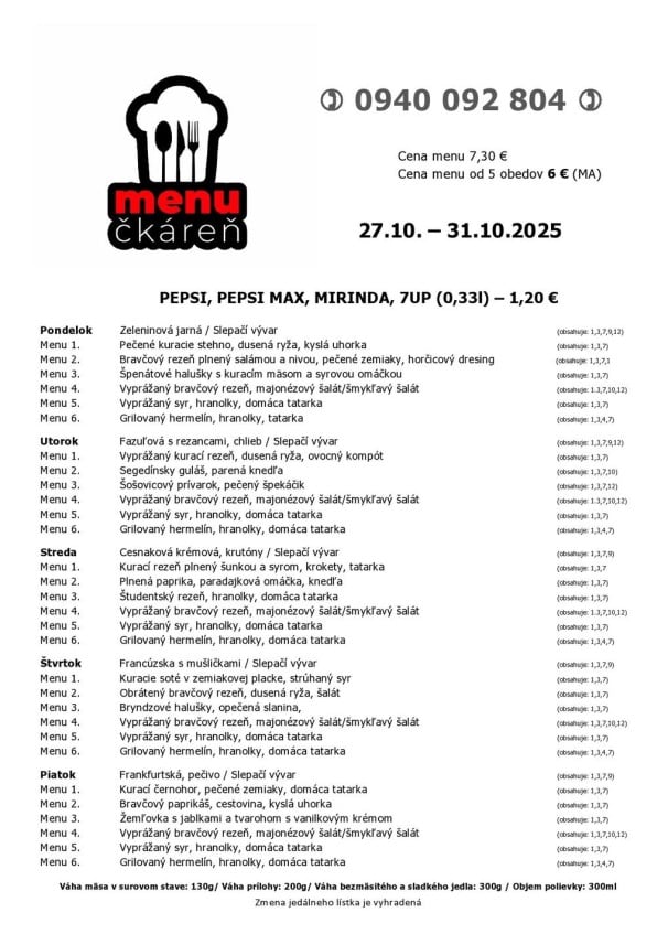 28.10.2025 0,3l Špenátová s vajcom a krutónmi (1,3,7) 130g 1. Prírodná kuracia kapsa plnená šunkou a syrom, dusená ryža s hráškom (1,7) 7.30 € 380g 2. Zemiakové guľky plnené údeným mäsom s kyslou kapustou a slaninkou (1,3,12) 7.30 € 420g 3. Palacinky s nutellou, ovocím a šľahačkou (1,3,7,8,12) 7.30 €