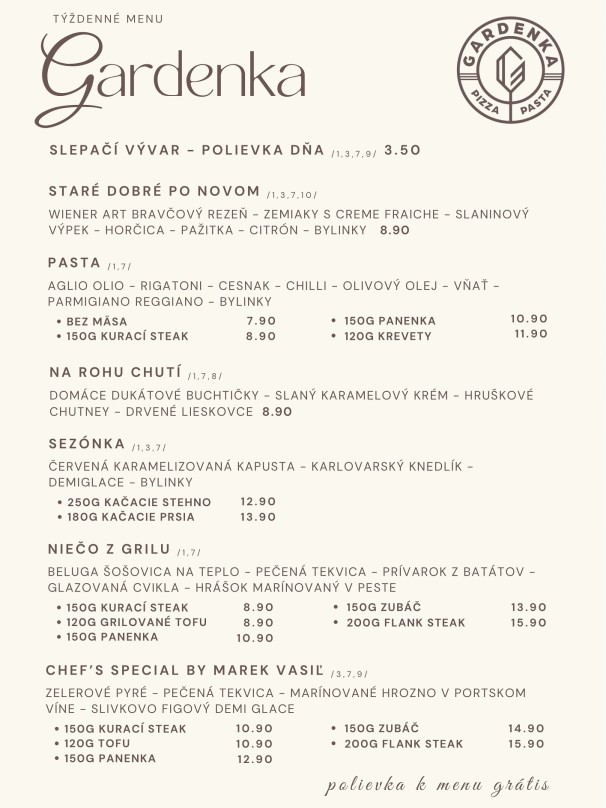 0,3 l Polievka Slepačí vývar (1,3) 0,3 l Polievka Mačanka (1,3,7) Menu 1: 150 g Pražská hovädzia falošná sviečková, šunková ryža (1,7) Menu 2: 300 g Cestoviny s tuniakom, parmezán (1,3,4,7) Biznis Menu: 180 g Fish & chips, hráškové pyré, americké zemiaky, domáca tatárska omáčka (1,3,4,7)