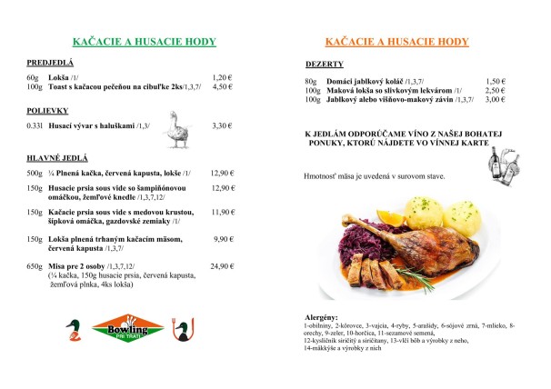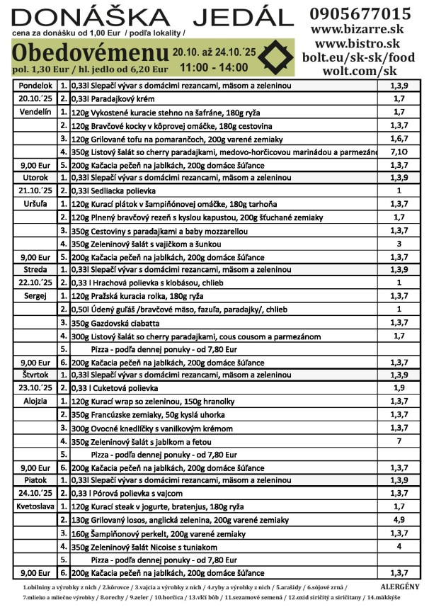 24.10.2025 1. Vývarová s rezancami a zeleninou 0.33l(1, 3, 9)1,40 €2. Paradajková s ryžou 0.4l1,90 €1. Koložvárska kapusta, chlieb 380g(7)6,50 €2. Vyprážané šampiňóny 150g, varené zemiaky, šalát 200g(1, 3, 7)6,50 €3. Vyprážaný pastiersky syr 120g, hranolky, tatárska omáčka 200g(1, 3, 7)6,50 €4. Vyprážaný kurací rezeň 120g, varené zemiaky, kyslá uhorka 200g(1, 3, 7)6,50 €5. Ovocné zemiakové knedlíčky s posýpkou a maslom 380g(1,3,7)6,50 €