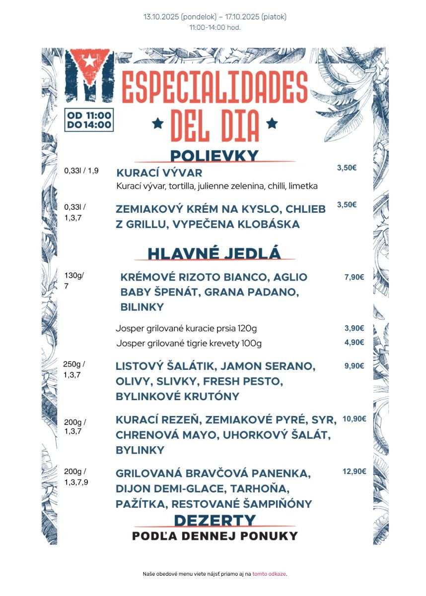 : 1, Fazuĺová s udeným mäskom1,9Slepačia polievka3,9 Cesnaková so syrom a krutonkami Menu 1. 140gr Kurací steak s bylinkovým maslom, ryža/hranolky 7,90,- Menu 2. 130gr Čienohorský kurací rezeň so syrom, pečené zemiaky, 1,3,7 7,90– Menu 3. 140gr Zapekané kuracie prsia s prosciutom a mozarellou,ryža/hranolky 7,90– Menu 4. 120gr Vyprážaný syr, hranolky, 1,3,7 7,90- Menu 5. 120gr Kurací stroganov, ryža 7 7,90- Menu 6. 350gr Kuracie prsia na nive, ryža/hranolky 7,90- Špeciál menu: 350gr Pečené kuracie stehno na spôsob kačky, červená kapusta, lokša/knedle1,7 8,90,- Nedeĺa : 1, Fazuĺová s udeným mäskom1,9Slepačia polievka3,9 Cesnaková so syrom a krutonkami Menu 1. 140gr Kurací steak s bylinkovým maslom, ryža/hranolky 7,90,- Menu 2. 130gr Čienohorský kurací rezeň so syrom, pečené zemiaky, 1,3,7 7,90– Menu 3. 140gr Zapekané kuracie prsia s prosciutom a mozarellou,ryža/hranolky 7,90– Menu 4. 120gr Vyprážaný syr, hranolky, 1,3,7 7,90- Menu 5. 120gr Kurací stroganov, ryža 7 7,90- Menu 6. 350gr Kuracie prsia na nive, ryža/hranolky 7,90- Špeciál menu: 350gr Pečené kuracie stehno na spôsob kačky, červená kapusta, lokša/knedle1,78,90,-