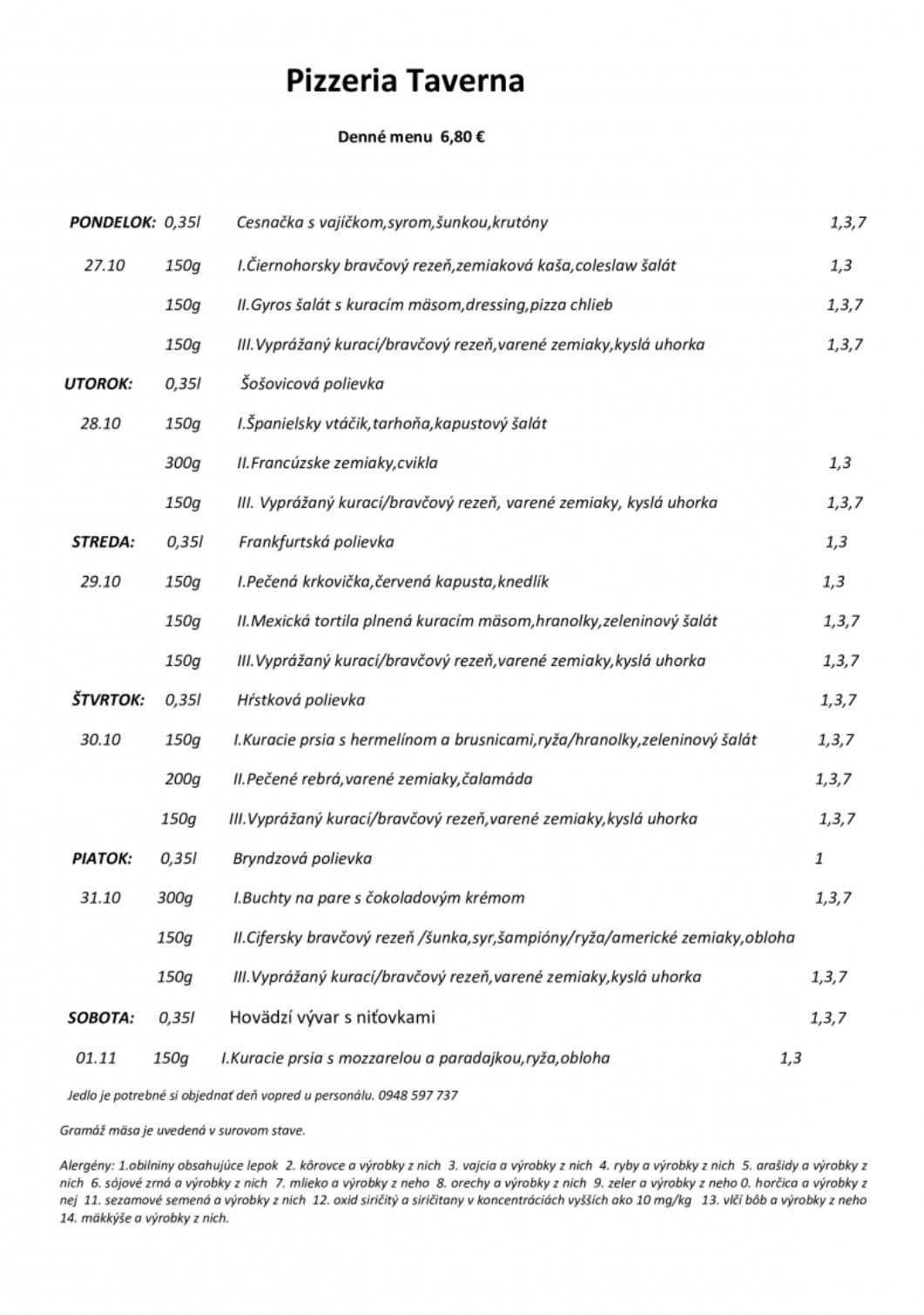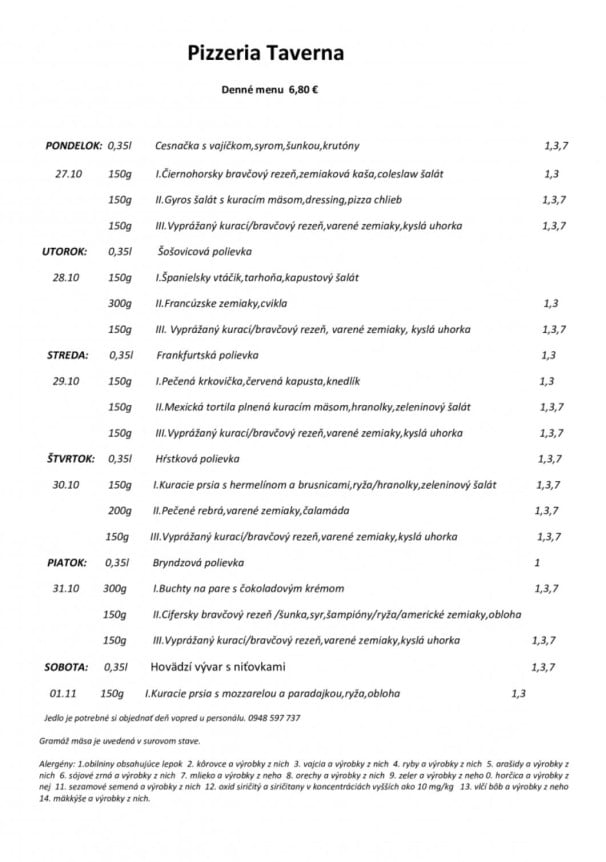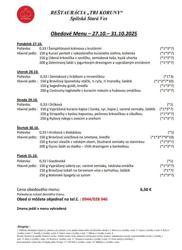 28,10,2025 POLIEVKA: HOVADZÍ VÝVAR S REZANCAMI 1,- 1, TATRANSKÝ ŠPÍZ, OBLOHA, HRANOLKY 6,- 2, KURACIE SOTÉ, OBLOHA, RYŽA 3,90 3, GRILOVANÝ LOSOS, BROKOLICA, KROKETY 8,80 4,VIEDENSKÁ ROŠTENKA, OBLOHA, OPEKANÉ ZEMIAKY 12,80