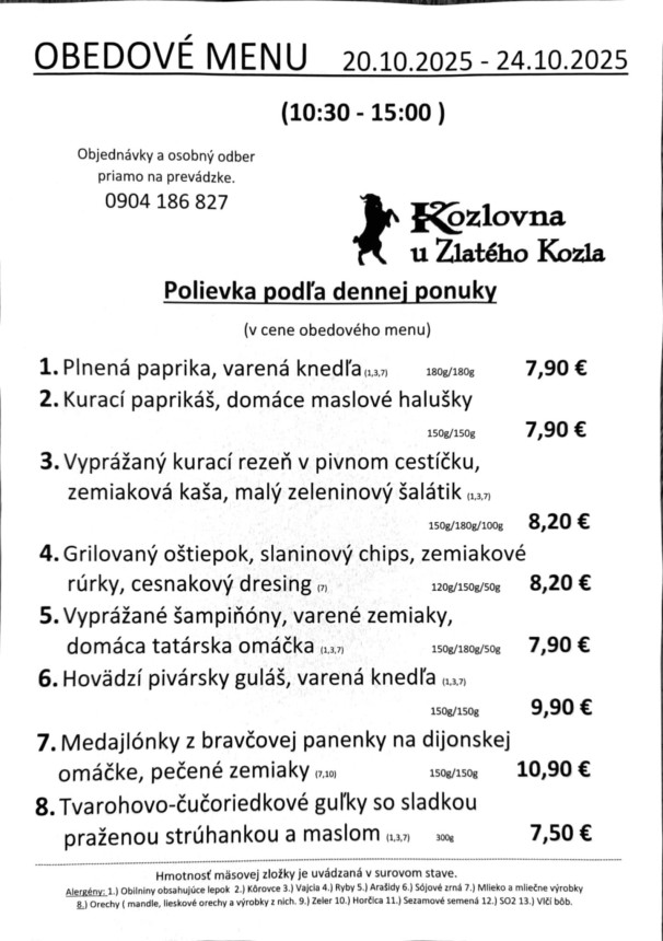 – 21. 10. 2025 Polievka: Frankfurtská (samostatne 2€)(1)Vývar so zeleninou a rezancami(k menu za príplatok 1€, samostatne 2.0€) 1. 150g Kurací steak, volské oko, ryža, šalát (1,3,7) €6.40 2. 150g Mletý rezeň so syrom, zemiaková kaša, uhorka (1,3,7) €6.40 3. 400g Granatiersky pochod, kyslá uhorka (1,3,7) €6.40 4. 120g Bravčová panenka v panko strúhanke, opekané zemiaky, T.O. (1,3,7) €7.50 5. 120g Segedínsky guláš, parená knedľa (1,3,7) €7.50