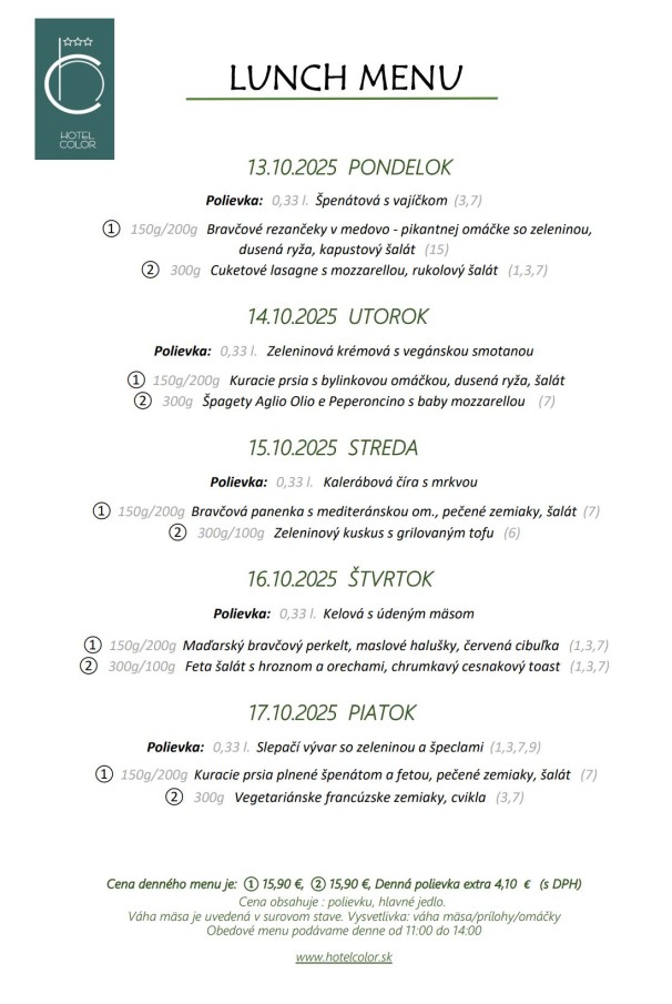 Polievka 0,25l | Zeleninová krémová - obsahuje A11,70 € Polievka 0,25l | Frankfurtská s párkom - obsahuje A11,90 € Polievka 0,25l | Kapustnica1,90 € 250 g | Menu 1 - DOMÁCE JEDLO | Jelení guláš, knedľa - obsahuje A1,3,78,50 € 250 g | Menu 2 - DOMÁCE JEDLO | Kurací steak v nivovej omáčke, ryža, šalát - obsahuje A1,3,77,50 € 250 g | Menu 3 - DOMÁCE JEDLO | Bravčové soté na hrášku, ryža, šalát - obsahuje A17,50 € 250 g | Menu 4 - DOMÁCE JEDLO | Vyprážaná kuracia pečeň, varené zemiaky, tatárska omáčka - obsahuje A1,3,77,20 € 250 g | Menu 5 - VEGETARIAN | Bryndzové halušky so slaninkou - obsahuje A1,3,77,90 € Prílohy dňa | varené zemiaky, ryža, knedľa2,50 €