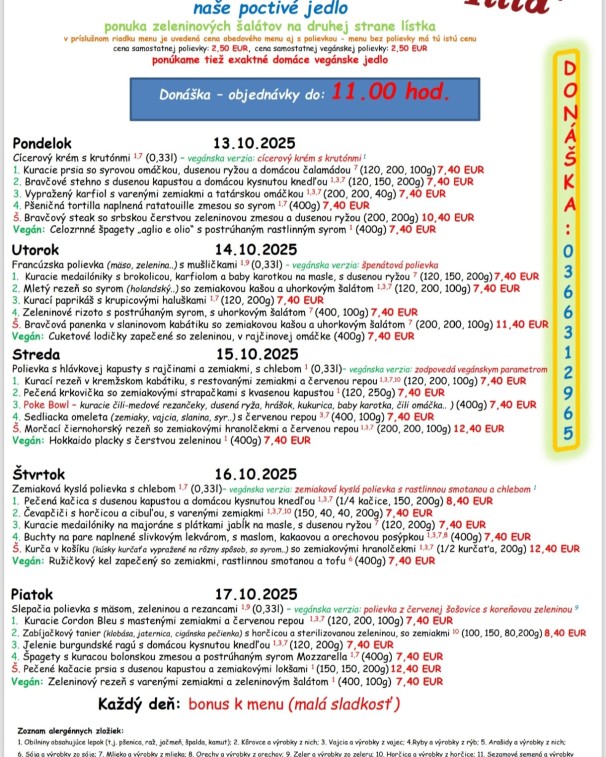 (18.10.2025) Polievka 1: 0,33 l, Domáca kapustnica s údeným mäsom, klobáskou a sušenými hríbami 1 doplatok k cene menu 1,50 € / samostatne cena 3,50 € Polievka 2: 0,33 l, Slepačí vývar s mäsom a rezancami 1 3 9 1. 130 g Zapekané kuracie prsia s hubami a nivou, zemiaková kaša, kapustový šalát 7 6.80 € 2. 130 g Bravčové stehno po cigánsky, tarhoňa, uhorka steril. 1 6.80 € 3. 350 g "Jarmočný tanier", 1/2 varené zemiaky, pikantné obloženie 100 g pečená klobása, 100 g pečená jaternica, 150 g pečené rebierka. 10 8.00 € 4. 280 g Pečené kačacie stehno, dusená kapusta, knedle/lokše 280 g kačacie stehno, 2 ks domáce lokše, 2 ks knedle, dusená kapusta. 1 3 7 9.50 €