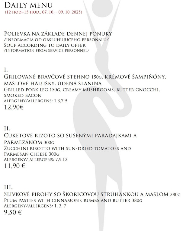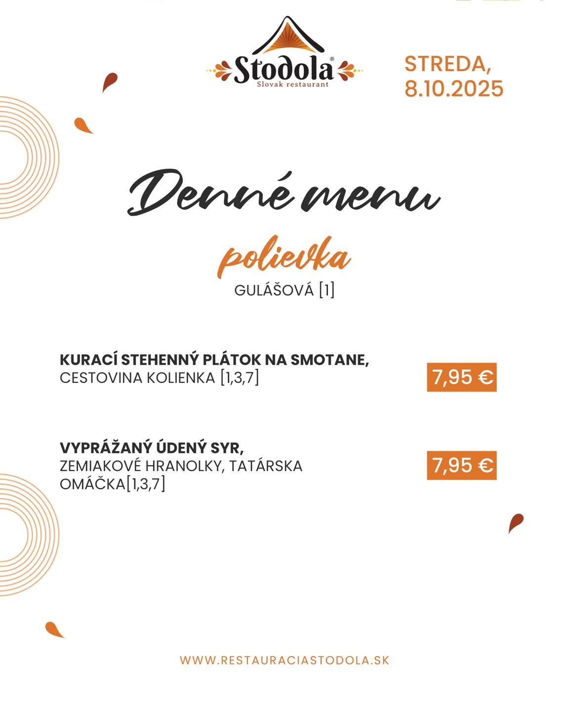 : 08,10,2025 POLIEVKA: KELOVÁ 1,- 1, DIABOLSKÉ SOTÉ, OBLOHA, OPEKANÉ ZEMIAKY 6,- 2,KURACIE NUGETKY,CESNAKOVÁ OMÁČKA,KYSLÁ UHORKA, HRANOLKY 6,50 3, ZELENINOVÉ KARI, RYŽA 6,- 4, SVIEČKOVÉ REZY, OBLOHA, KROKETY 12,80