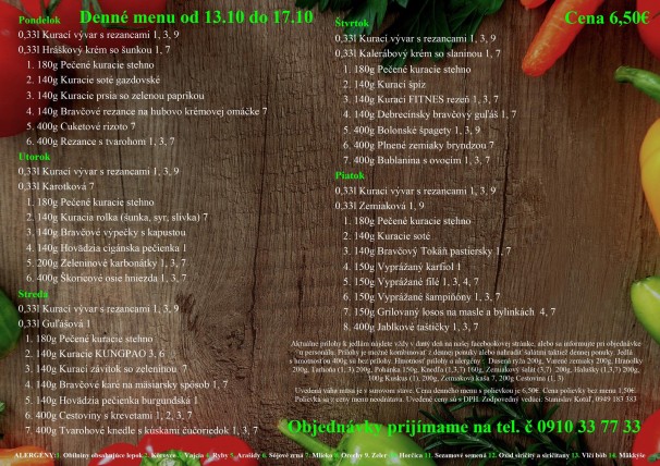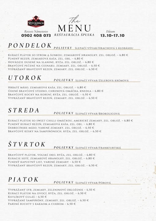 Polievky: Zeleninová s cestovinou / Krém z červenej šošovice Hlavné jedlá Jelení guláš, knedľa – 6.50 € Pečený bravčový bôčik, dusená kapusta, knedľa – 6.50 € Bravčové mäso na provensálskom korení, pučené zemiaky, kyslá uhorka – 6.50 € Vykostené kuracie stehno, syrová omáčka, ryža, hranolky – 6.50 € Vyprážaný hermelín, hranolky, tatárska omáčka – 6.50 € Šopský zeleninový šalát, hrianka – 6.50 €