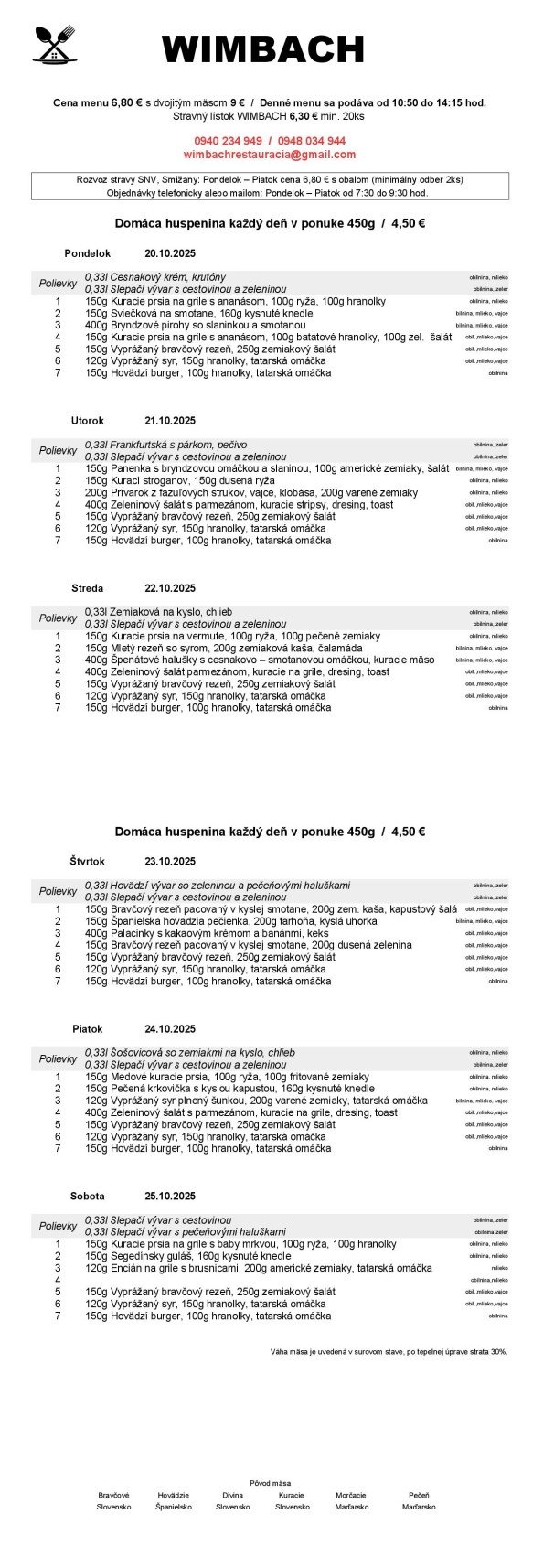 ku obľúbenýmVaríme denné menu pondelok-sobota z čerstvých surovín. Príďte ochutnať, alebo Vám radi dovezieme. Objednávajte 0940 234 949, 0948 034 944 alebo wimbachrestauracia@gmail.com.
