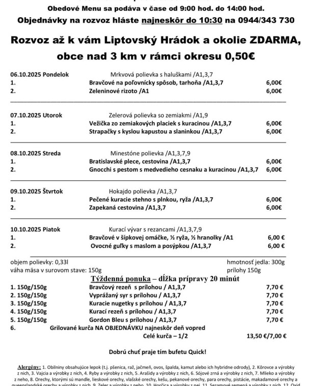 10.10.2025 Polievka: 0,35l Pórová polievka s vajíčkom (1,3) Hlavné jedlo 1: 150/250g Bravčový tokáň na mäsiarsky spôsob, dusená ryža, zeleninový šalát (1) Hlavné jedlo 2: 420g Francúzske zemiaky, kyslá uhorka (3,7) Hlavné jedlo 3: 400g Moravské koláče (1,3,7) Týždenné menu 1: 150g/250g Vyprážaný Cordon-bleu, hranolky, kompót (1,3,7) 7,40 EUR Týždenné menu 2: 150g/250g Zabíjačkový tanier /bôčik, jaternica, klobása/, kyslá kapusta, zemiaky (1,3,7) 7,40 EUR