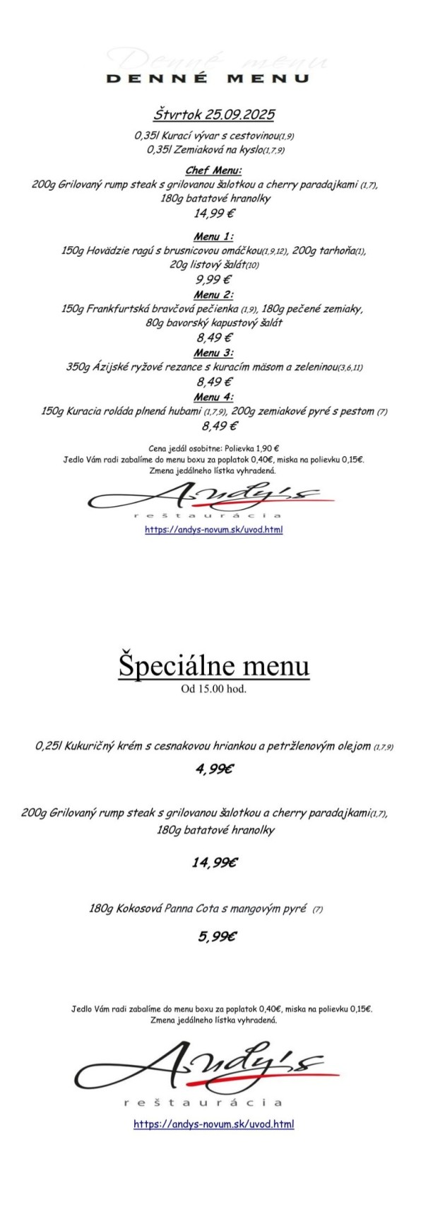 25.09.2025 P 0,4l Krupková so slaninou /1,7/ 1. 150g/200g Prírodný kurací gordon blue , dusená ryža so zeleninou 1,7 2. 150g/200g Pikantné kuracie krídelká, hranolky, limetková kyslá smotana 1,7,10 3. 150g/200g Bravčový guľáš na červenom víne s restovanou cibuľkou , karlovarská knedľa 1,3,7,9,10,12 4. 150g/200g Bravčová faširka so zemiakovou kašou paradajkový šalát 1,3,7 5. 350g Špenatové halušky so syrovou omáčkou a stuhaným chedarom 1,3,7 6. 350g Linguine s bazalkovým pestom, cherry paradajkami a parmezánom 1,3,7,8