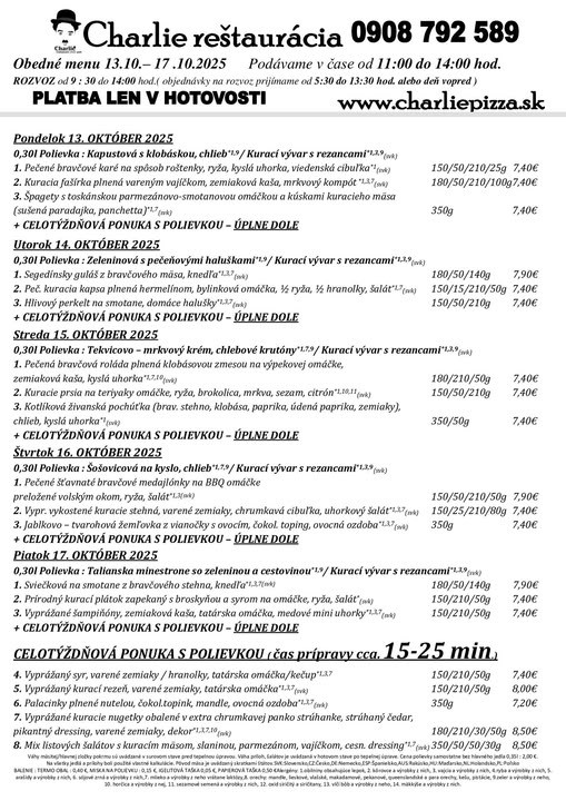 : Pol. Hrachová krémová s párkom / Domáci vývar (180G/200G) Čevabčiči, varené zemiaky, horčica, cibuľka 7,50€ (150G/180G) Bravčový černohor so strúhaným syrom, hranolky (1,3,7) 7,50€ (350g) Bryndzové pirohy s kyslou smotanou, cibuľou a slaninou 7,50€