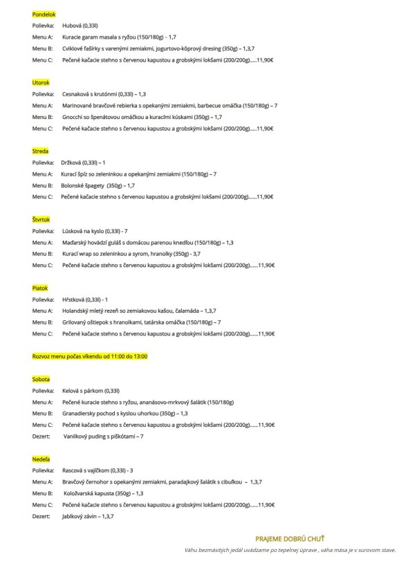 Víkendové menu 04. - 05. 10. 2025 Polievka Krémová hrášková polievka so slaninou, toskánsky chlieb (1,7,12) 0,4l 4.50 € Menu 2 Vyprážaný kurací rezeň v panko strúhanke, dusená ryža, uhorkový šalát (1,3,7) 150g 7.80 € Menu 3 Konfitovaný steak z krkovičky, skaramelizovaná cibuľa, pučený zemiak 150g 8.50 €