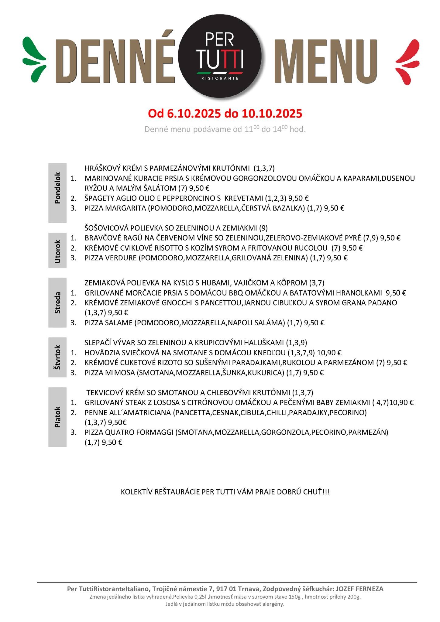 , 10. OKTÓBRA 0,33l — Kelová polievka s klobásou 120g — Pečené kur. stehno s pečienkovou plnkou, ryža, kompót 1,3 9,90€ 120g — Vyprážaný syr, opekané zemiaky, tatárska omáčka 1,3,7 9,90€ 120g — Vyprážaný zubáč v panko strúhanke, štajerský zemiakový šalát 1,3,4,7,10 10,50€ 120g — Šalát s granátovým jablkom, kuracím mäsom, parmezán, bageta 1,3,7,10 9,90€