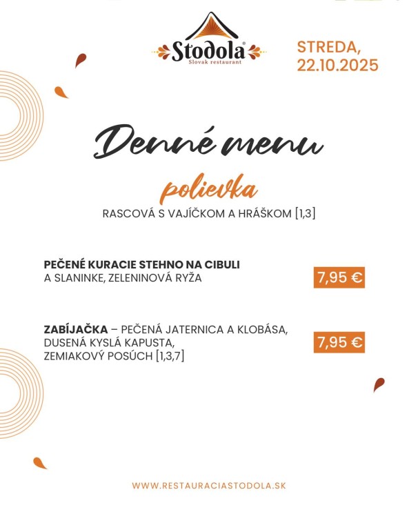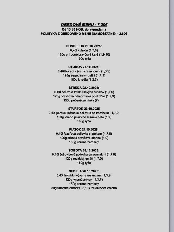 22.10.2025 Polievka: 0,33 l Zeleninová s mäsovými knedličkami 3 1,20 € 0,33 l Kurací vývar 1,3,9 1,20 € 0,33 l Cesnačka 7 1,80 € MENU 1: 150g Morčacie stehno na červenom víne, 200g pečené zemiaky, šalát 6,20 € MENU 2:150g Hlivový paprikáš s kúskami bravčového mäsa, 200g tarhoňa 1,3 6,20 € MENU 3: 300g Lievance plnené ovocím s citrónovým krémom 1,3,7 6,20 € MENU 4 :150g Vyprážaný bravčový rezeň, 150g varené zemiaky, kyslá uhorka 1,3,7 6,20 € MENU 5: 300g Zeleninový šalát podľa dennej ponuky, ( kuracie mäso, tuniak, encián) 2 ks toast 6,20 € MENU 6: 300g „KEBAB“ tanier s ryžou a hranolkami , dressing 7,20 € MENU 7: 180g Vyprážaná gazdovská parenica s údenou šunkou, 150g hranolky, 30g tatárska omáčka 1,3,7 7,20 € MENU 8: 350g Burger s trhaným bravčovým mäsom, alebo s kuracím stripsami, pikantný dip, zemiakové hranolky 1,3,7 7,50 €