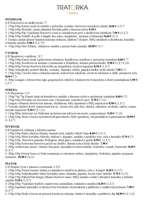 0,3l polievka: Cesnaková so syrom a šunkou 7 /Slepačí vývar s rezancami 1,3,9 601 150g Mexický hovädzí guláš s hráškom posypaný strúhaným údeným syrom, dusená ryža 1,7 7,60€ 602 150g Bravčové výpečky na cibuľke a cesnaku s kyslou kapustou, domáca parená knedľa 1,3,7 7,40€ 603 150g Kuracie rezníky obaľované v cornflakes so zemiakovým pyré a mrkvovo- jablkovým šalátikom 1,3,7 7,40€ 604 300g Špagety Bolognesse s mletým mäsom a strúhaným parmezánom 1,3,7 7,40€